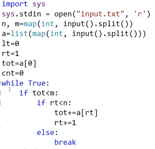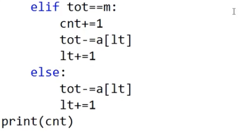 elif sum(a[p1:p2]) < M: