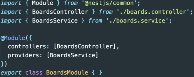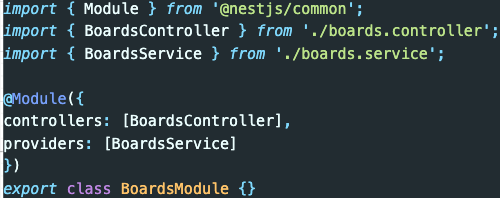 게시글을 위한 BoardModule안에 BoardController와 BoardService를 모듈안에 아래 와 같이 넣어주시면 됩니다. 우선은 간단하게 이렇게 되는 것이구나만 보고 가겠습니 다