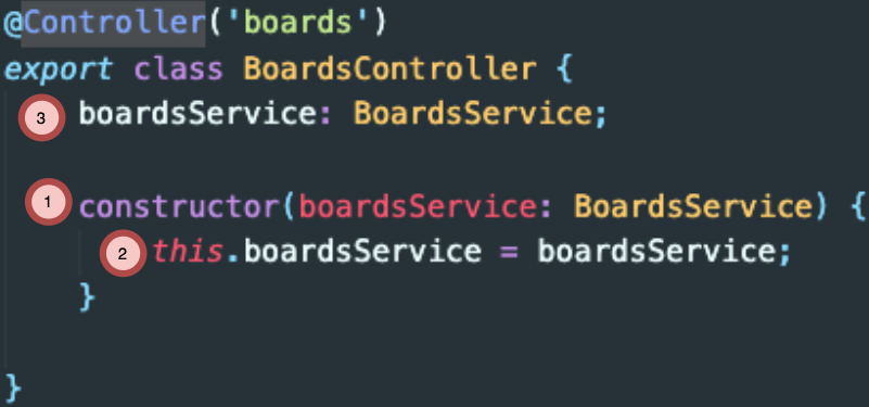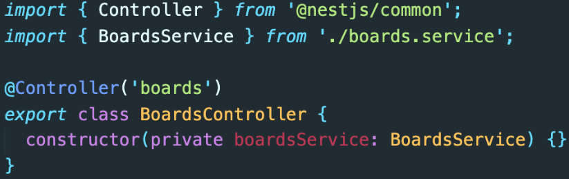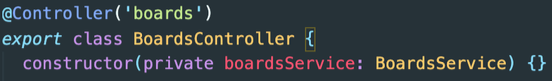 위를 보면 BoardsService를 Contructor 클래스에서 가져오고(Injected) 있습니다. 그런 후 Private 문법을 사용하고 있습니다.