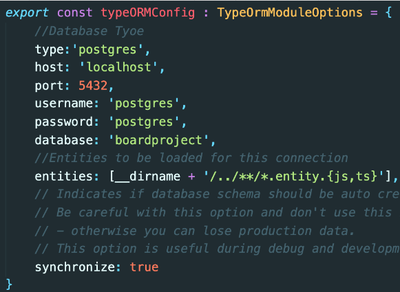 하나씩 작성하면 entities: [User, Board] User 엔티티와 Board 엔티티를