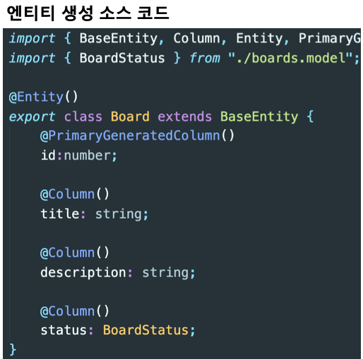- Column () 데코레이터 클래스는 Board 엔터티의 title 및 description과 같은 다른 열을 나타내는 데 사용됩니다.