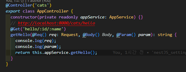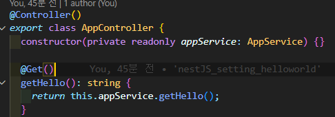 보통은 this.appservice=appservice로 생성자 내에서 초기화를 하지만 nest에서는 typeScript를 문법을 써서 중괄호 생략.