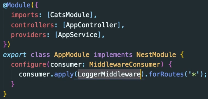 미들웨어를 포함하는 모듈은 NestModule 인터페이스를 구현해하하며 LoggerMiddleware에서 설정을 한다.