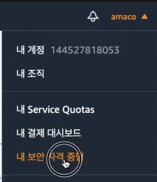 그리고 보안 자격으로 들어가서 엑세스키를 생성한다.