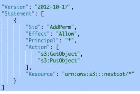그 후 권한에 들어온 뒤 버킷 정책에 들어와 편집을 한다. 정책 예제로 가서 아래와같은 틀로 정책을 알려주는것을 확인한다.