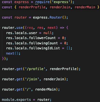 라우터의 미들웨어를 컨트롤러(라우터 마지막에 위치해 응답을 보내는 미들웨어)에서 불러옴.