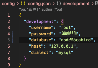 MySQL 비밀번호를 password에 넣고 데이터베이스 이름을 nodemocabird로 바꾼다.