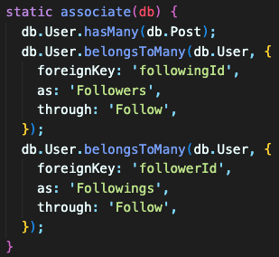 foreignKey가 followerId(팔로워 ID)면 as는 Followings(팔로잉)이고,