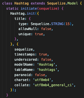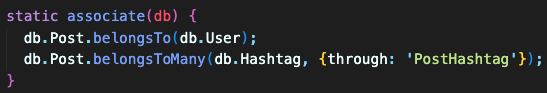 N:M 관계이므로 PostHashtag라는 중간 모델이 생기고, 각각 postId와 hashtagId라는 foreignKey도 추가된다.