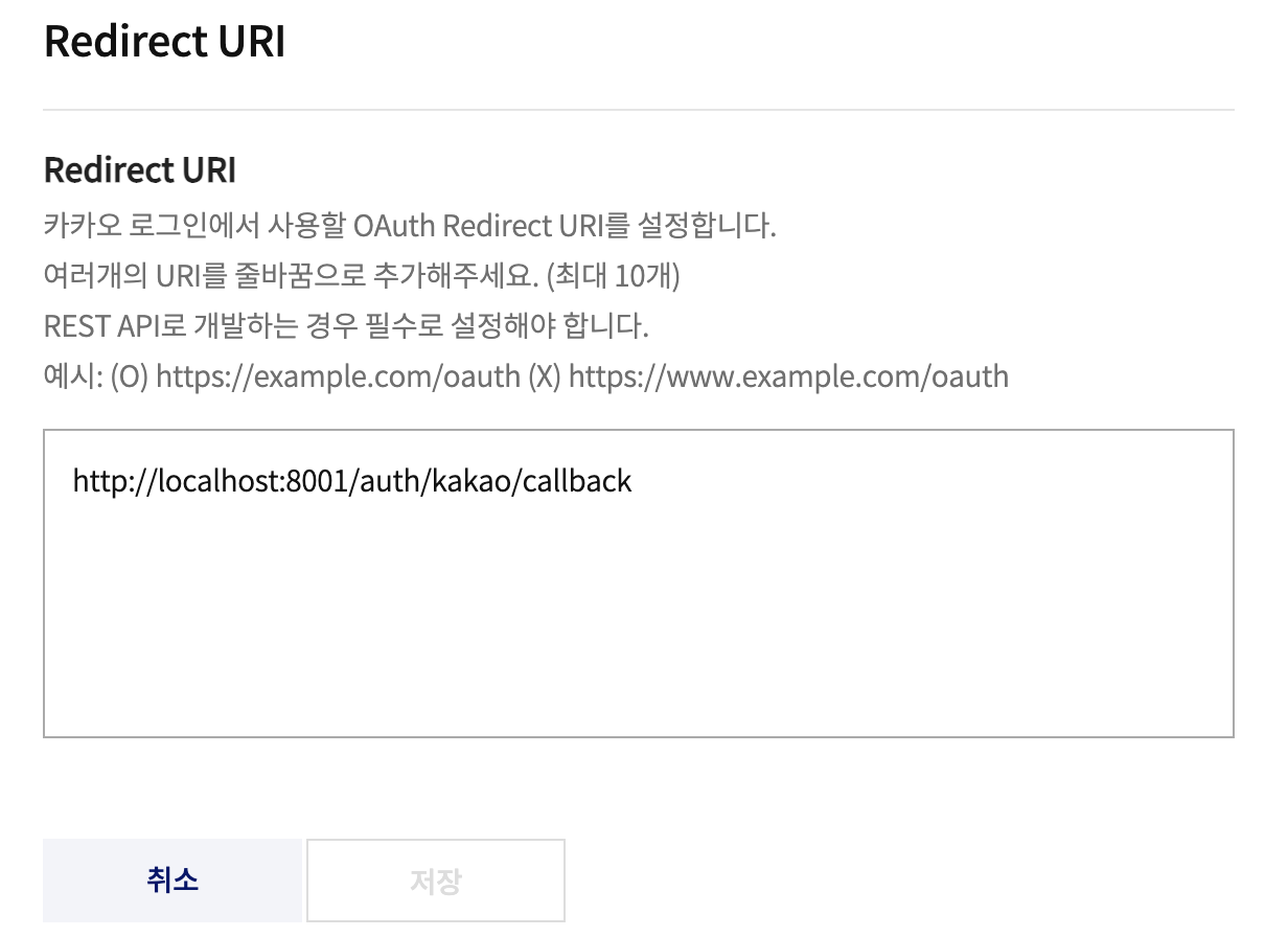 http://localhost:8001/oauth를 지우고 http://localhost:8001/auth/kakao/callback을 입력한 후 저장합니다. /auth/kakao/callback 부분은 kakaoStrategy.js의 callbackURL과 일치해야합니다.