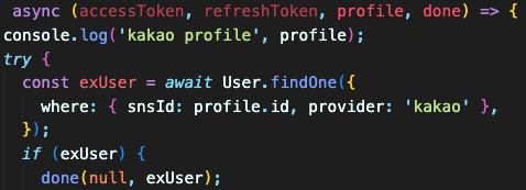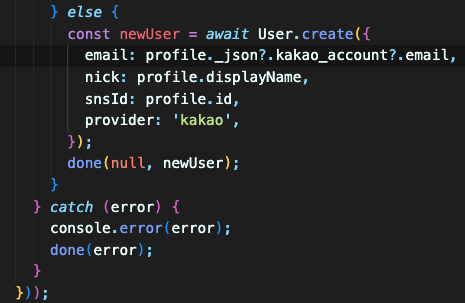 있다면 이미 회원가입되어 있는 경우이므로 사용자 정보와 함께 done 함수를 호출하고 전략을 종료합니다.