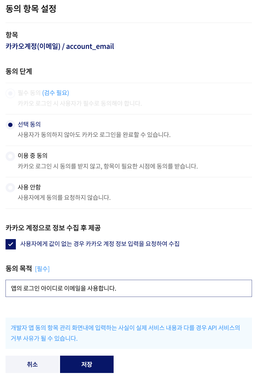 이메일 동의 단계에서는 선택 동의를 선택하고, 혹시나 값이 없는 경우를 대비해 카카오 계정으로 정보 수집 후