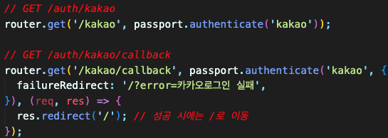 이 라우터에서는 카카오 로그인 전략을 다시 수행합니다.