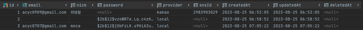 나는 mysql workbench가 아닌 datagrip을 주러 쓰므로 로컬, 카카오 로그인 각각 진행 후