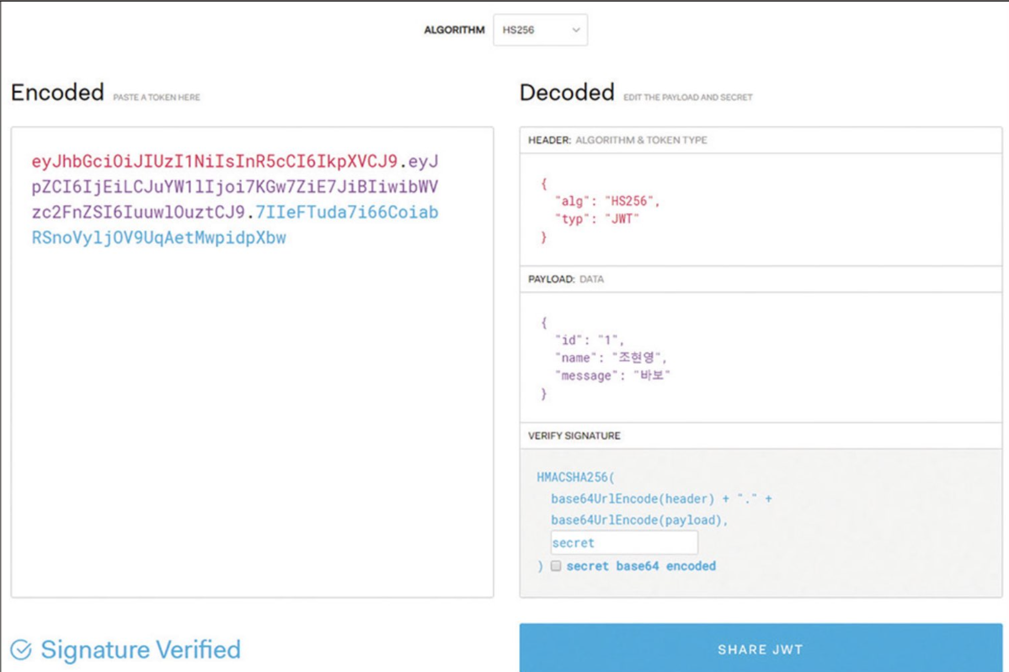 메서드의 첫 번째 인수로는 토큰을, 두 번째 인수로는 토큰의 비밀키를 넣습니다.