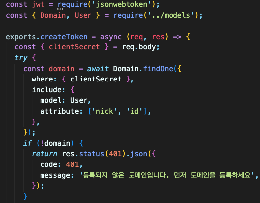 등록되지 않은 도메인이라면 에러 메시지로 응답하고, 등록된 도메인이라면 토큰을 발급해서 응답합니다.