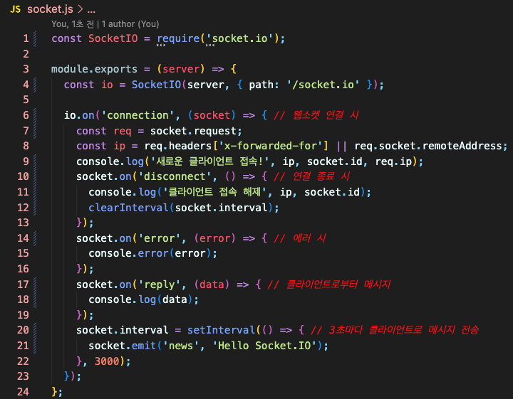 먼저 socket.io 패키지를 불러와서 익스프레스 서버와 연결합니다.