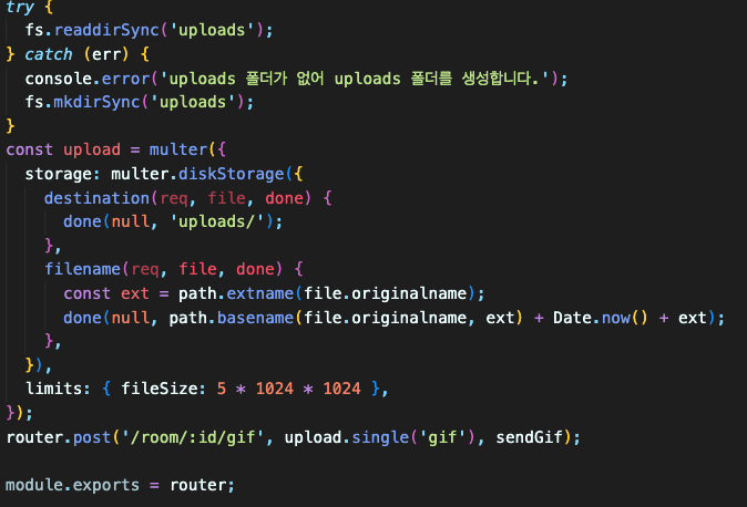 uploads 폴더에 사진을 저장하고, 파일명에 타임스탬프(Date.now())를 붙이고, 사이즈를 제한했습니다.