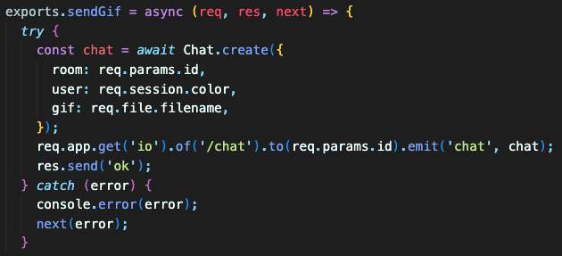 파일이 업로드된 후에는 내용을 데이터베이스에 저장하고, 방 안에 있는 모든 소켓에 채팅 데이터를 보냅니다.