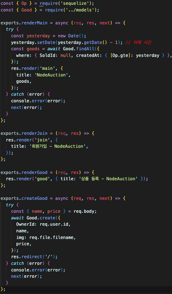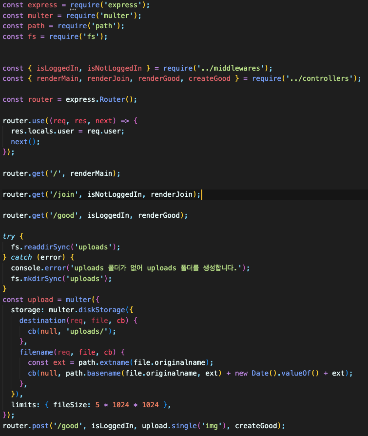 POST /good 라 우터는 업로드한 상품을 처리하는 라우터이며, 상품 이미지 업로드 기능이 있어 multer 미들웨어 가 붙었습니다.