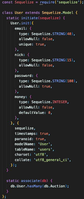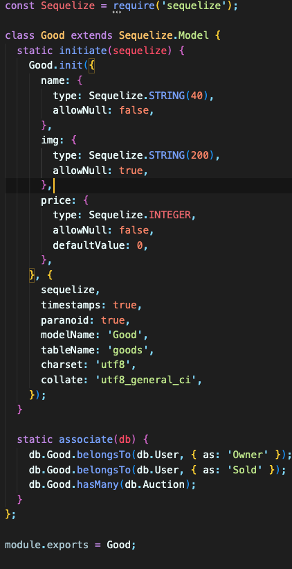 경매 모델은 사용자 모델 및 상품 모델과 일대다 관계를 가지며, 경매 모델에는 userId 컬럼과 GoodId 컬럼이 생성됩니다.