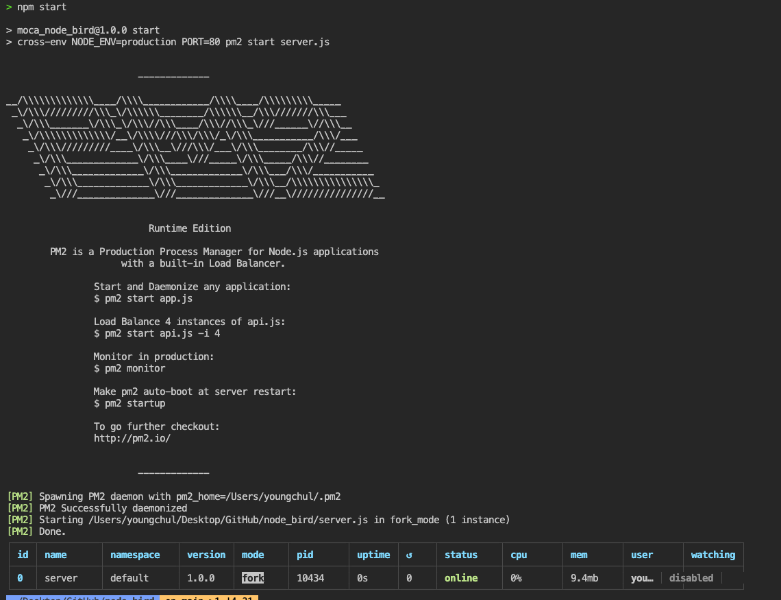 start 스크립트에 node server 대신 pm2 start server.js를 입력했습니다.