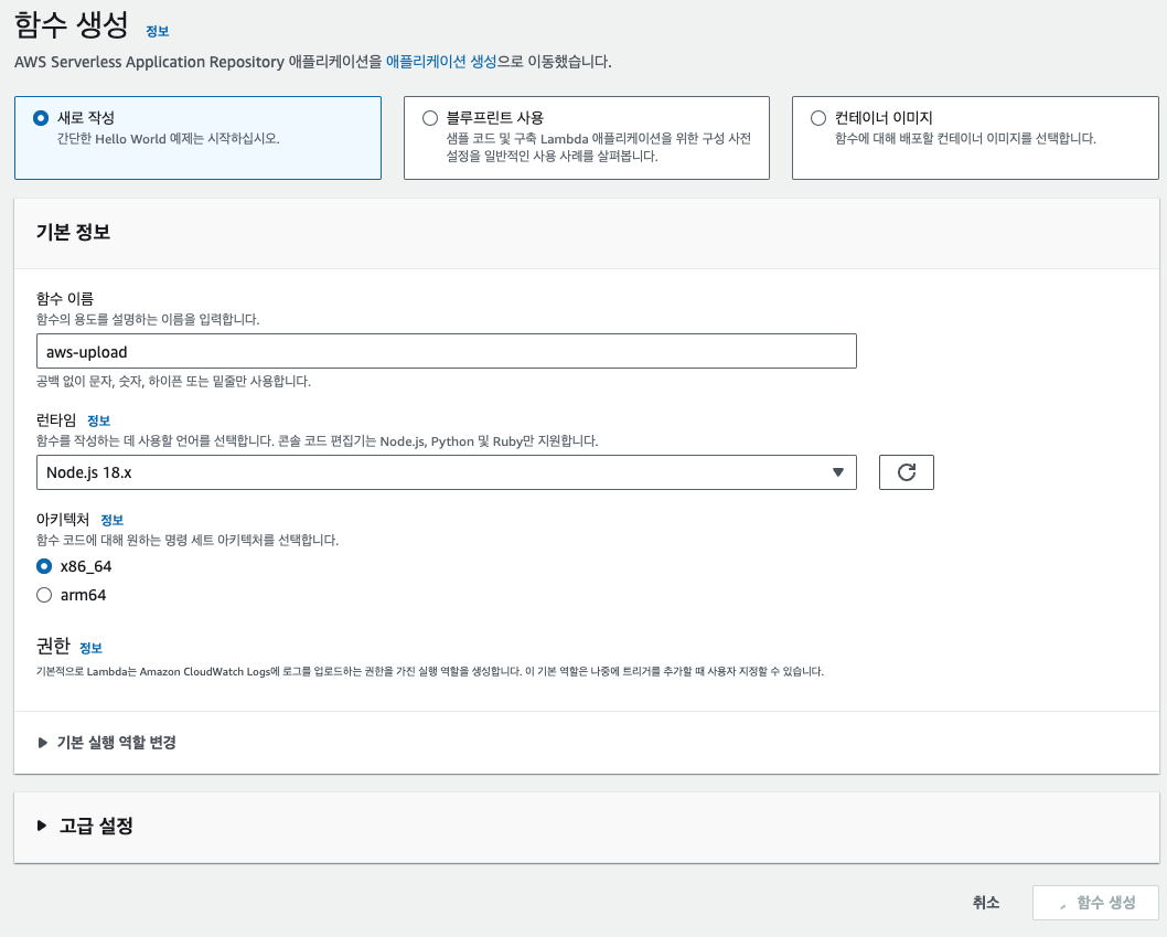 함수명을 aws-upload로 하고 런타임은 Node.js 18.x로 설정합니다(람다는 지원하는 노드 버전에 제약을 두고 있습니다).