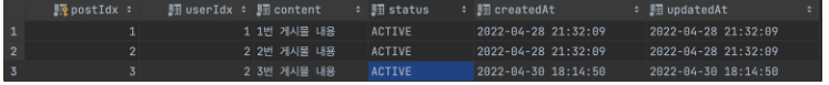 Post에서 활성화 상태이면서, userIdx가 2번인 사람의 postIdx를 구하는 것이다