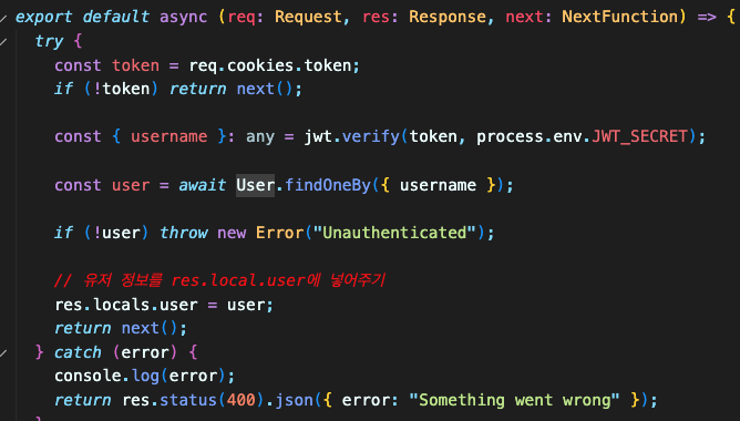 많은 핸들러에서 유저 정보를 필요로 하고 유저 정보나 유저의 등급에 따 라서 인증을 따로 해줘야한다.