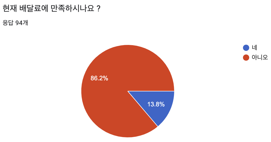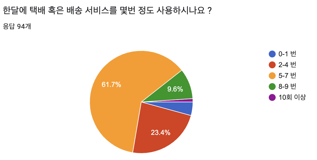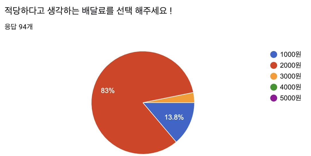 또한 한달에 5-7번 정도의 배송 서비스를 이용하지만 배달료에 대한 불만을 가지고 있으며 현재 배달료 평균인 4000원의 절반 인 2000원을 선호 하는 것을 알 수 있었다.