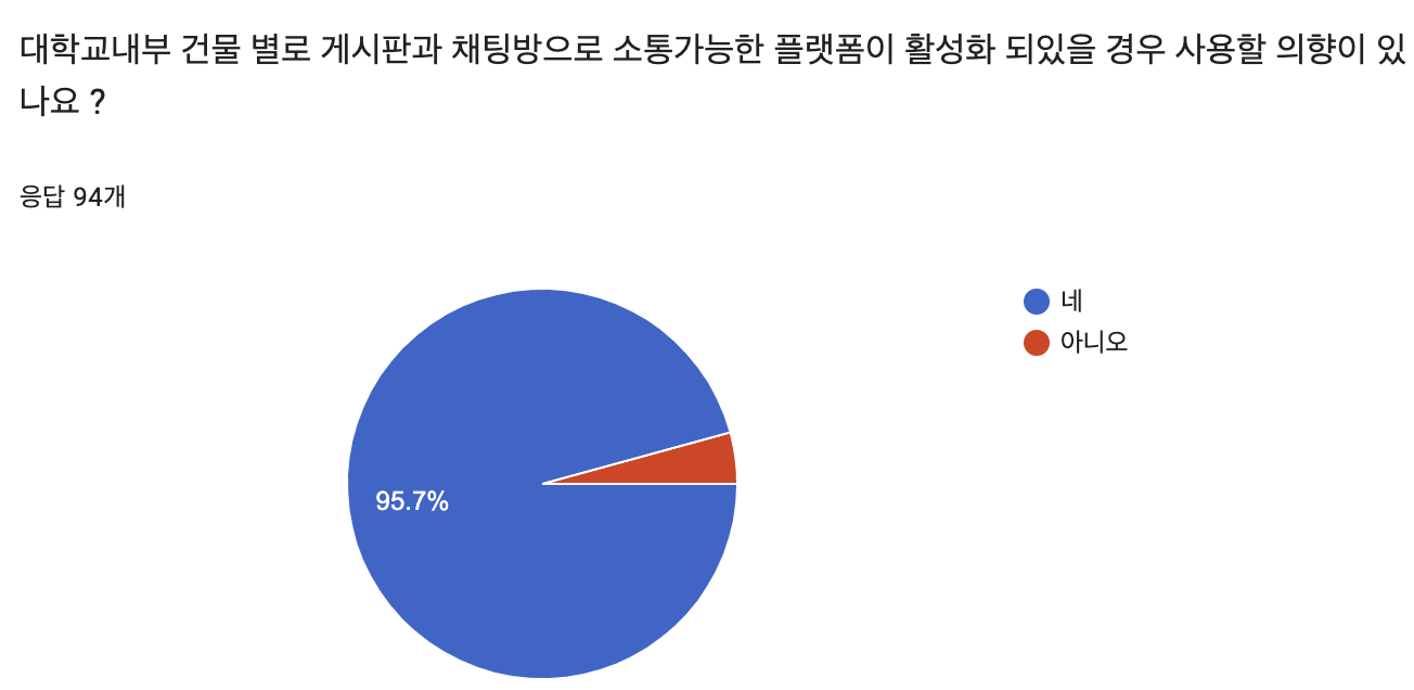 아래의 건물별 소통 플랫폼의 활성화시 사용의향이 90프로가 넘는걸로 보아 위의 질문들의 애로사항이 해결될것이고