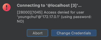 분명 위 명령어로 막 생성했던 유저 아이디와 비밀번호가 확실히 맞음에도 불구하고 접근 거부가 나왔다.