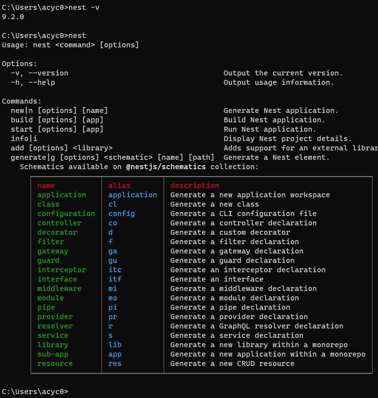 난 이미 설치 되있으므로 nest -v 로 설치된 버전을 확인해 보고 nest를 입력하여 커맨드의 리스트를 확인해 본다.