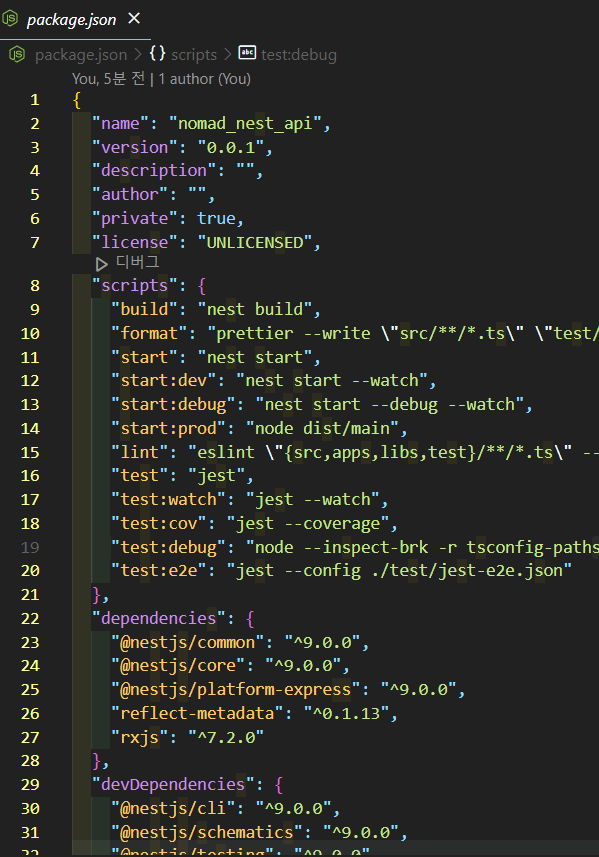 그리고 vscode에 가보면 package.json과 tsconfig.json 과 tsconfig.build.json에 많은 스크립트 설정들이 이미 되어있다.