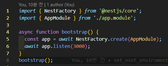 이 함수는 NestFactory.create(AppModule) 를 호출하고 3000번 포트를 리스닝하고 있다.