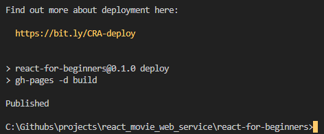 그럼 한번 npm run deploy를 해보자 여기 보이는 것처럼, 먼저 predeploy가 실행되고