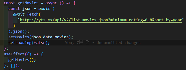 그래서 이걸 옮겨줄건데 이걸 getMovie 함수라고 해두고 여기에 function 혹은 const getMovie를 만들어주자