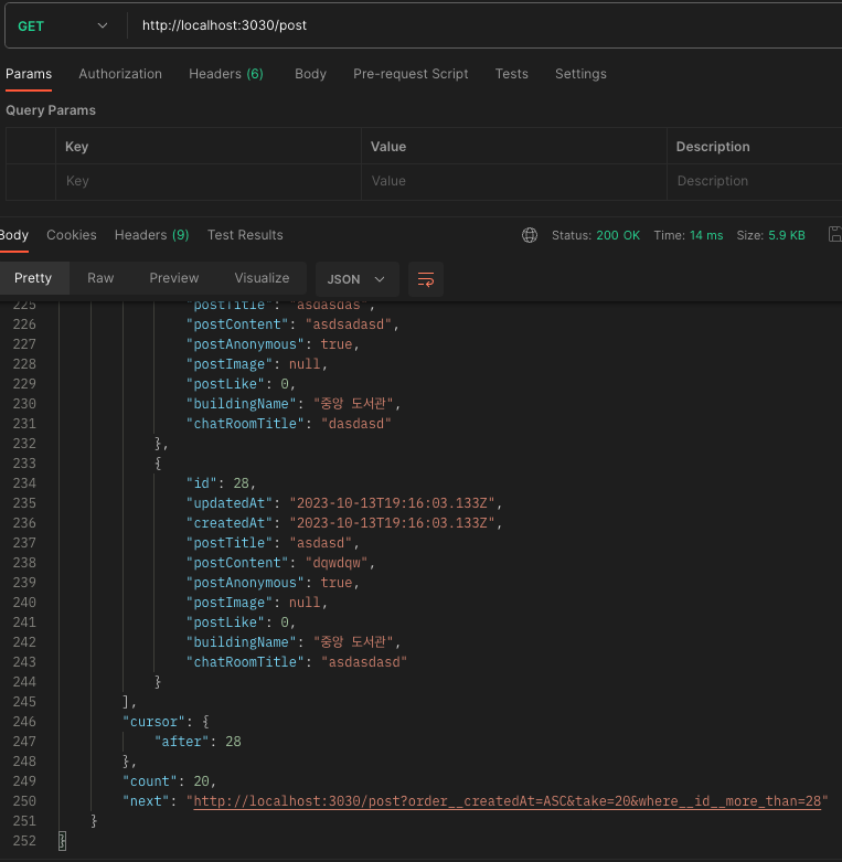 lastItem을 생성하는 조건을 가져온 게시글의 갯수와 take의 갯수가 같아야만 다음 페이지를 생성하기 위해 필요한