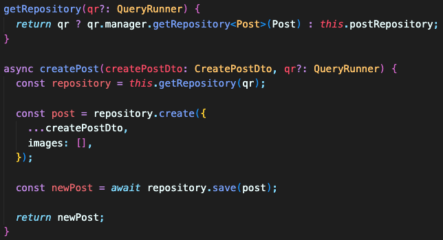 트랜잭션은 똑같은 쿼리러너를 사용해야 작용이 되므로 getRepositry를 사용해서 가져와서 사용