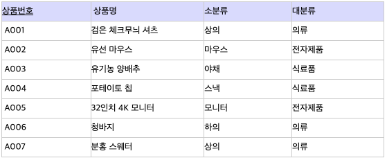 이 릴레이션에서 '상품번호'를 알면 '소분류'를 알 수 있고, '소분류'을 알면 '대분류'도 알 수 있다.