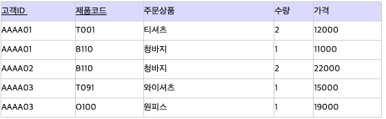 기본키가 '고객ID'와 '제품코드' 속성으로 구성된 위의 릴리이션에서서 '주문상품'은 기본키 중 '제품코드'만 알아도 식별할 수 있다.