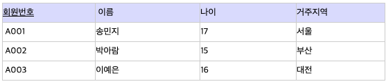 따라서 '이름', '나이', '거주지역'은 '회원번호'에 완전 함수 종속된 관계이다 .