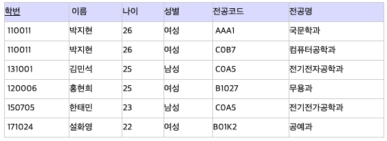 같은 이유로 전공 속성또한 '전공코드'에 함수적인 종속관계에 있다.