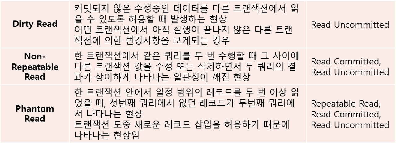 DIRTY READ 발생DIRTY READ 트랜잭션이 작업이 완료되지 않았는데도 다른 트랜잭션에서 볼 수 있게 되는 현상 💡 예시 트랜잭션 A가 실행되고 update 됐을 때 그 사이에트랜잭션 B가 실행된다. 그러면트랜잭션 A에서 커밋이 되지 않았음에도 불구하고,트랜잭션 B에서트랜잭션 A가 update한 내용을 확인할 수 있게 된다.