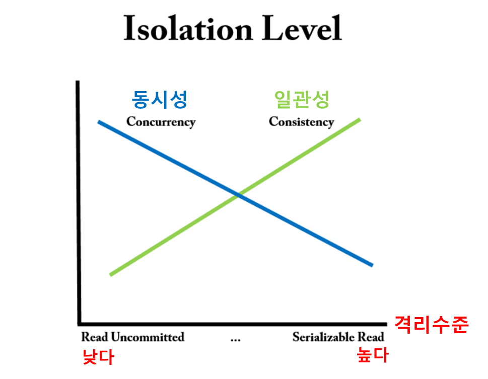 격리 수준이 높아지면서 데이터의 일관성이 유지될 수 있지만, 동시에 처리가능한 트랜잭션의 양은 떨어집니다. 격리수준이 낮아지면 일관성은 유지되기 어렵지만, 동시에 처리할 수 있는 트랜잭션의 양은 늘어나게 됩니다.