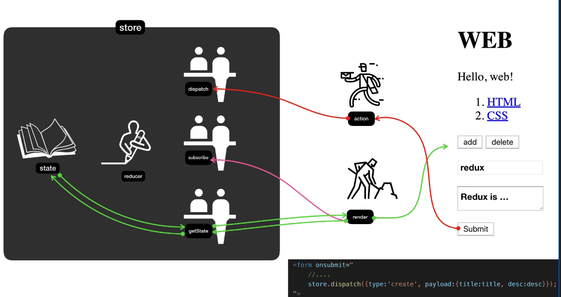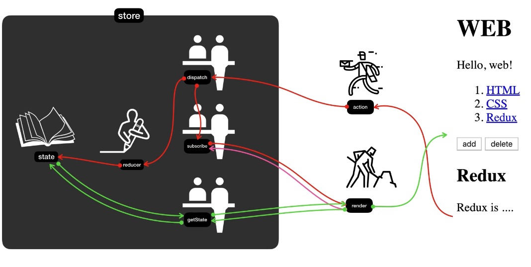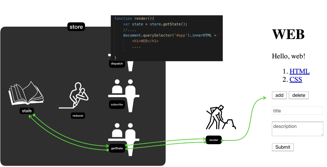1. reducer를 호출하여 state의 값을 바꾼다. 그리고 2. subscribe를 이용해서 render를 호출한다. 그러면 화면이 갱신된다.